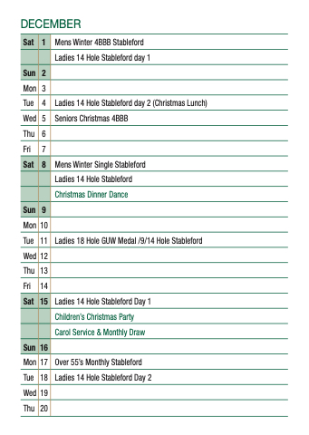 Tue Ladies 14 Hole Stableford day 2 (Christmas Lunch) Wed Seniors Christmas 4BBB