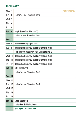 18 Hole GUW Medal / 14 Hole Stableford Day 2 Wed On Line Bookings now available for Open Week Thu On Line Bookings now available for Open Week Fri On Line Bookings now available for Open Week