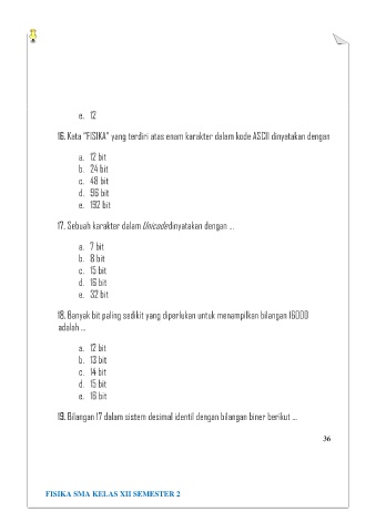 16. Kata “FISIKA” yang terdiri atas enam karakter dalam kode ASCII dinyatakan dengan