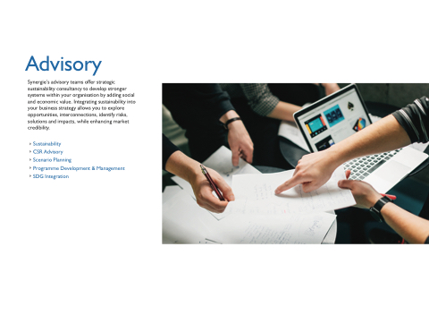 Synergie’s advisory teams offer strategic sustainability consultancy to develop stronger systems within your organisation by adding social and economic value. Integrating sustainability into your business strategy allows you to explore opportunities, interconnections, identify risks, solutions and impacts, while enhancing market credibility.
