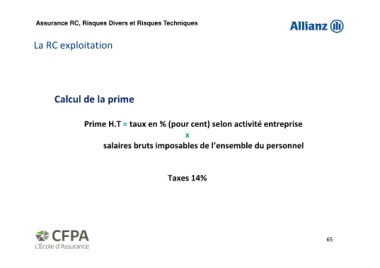 65 taux en % (pour cent) selon activité entreprise Taxes 14% Assurance RC, Risques Divers et Risques Techniques x salaires bruts imposables de l’ensemble du personnel La RC exploitation Calcul de la prime Prime H.T =
