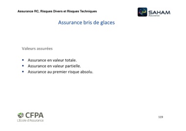 119 Assurance bris de glaces Assurance RC, Risques Divers et Risques Techniques absolu. totale. partielle. risque valeur valeur premier assurées en Assurance en Assurance au Assurance Valeurs