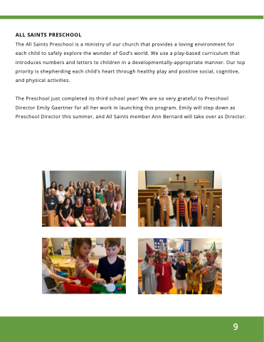 The Preschool just completed its third school year! We are so very grateful to Preschool Director Emily Gaertner for all her work in launching this program. Emily will step down as Preschool Director this summer, and All Saints member Ann Bernard will take over as Director.