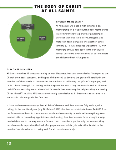 It is an understatement to say that All Saints’ deacons and deaconesses fully embody this calling. In the last fiscal year (July 2017-June 2018), the deacons distributed over $45,000 from the Benevolence Fund to those in our church and community to assist with everything from medical bills to counseling appointments to housing. Our deaconesses have brought a long- needed dynamic to the way we care for our church members, particularly our women; they have been able to provide the kind of engagement and ministry in crisis that is vital to the health of our church and to caring well for all those in our body.