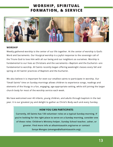 Currently, All Saints has 130 volunteer roles on a typical Sunday morning. If you’re looking for the right place to serve on a Sunday morning, consider one of these roles: Children’s Ministry helper, Sunday School teacher, usher, or greeter. Find more info at allsaintsaustin.org/serve or contact