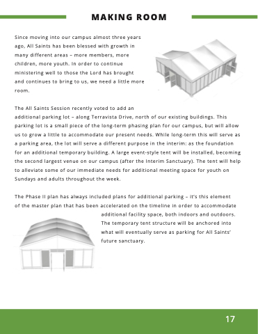 additional facility space, both indoors and outdoors. The temporary tent structure will be anchored into what will eventually serve as parking for All Saints’ future sanctuary.