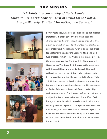 called to live as the body of Christ in Austin for the world, through Worship, Spiritual Formation, and Service.”