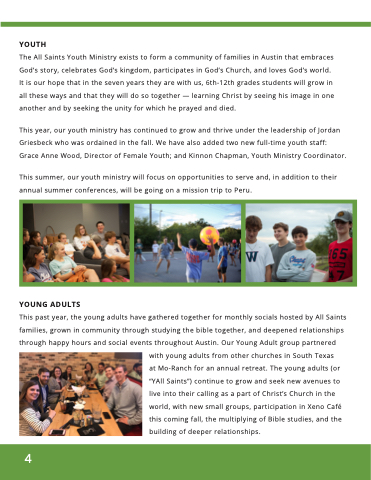 This past year, the young adults have gathered together for monthly socials hosted by All Saints families, grown in community through studying the bible together, and deepened relationships through happy hours and social events throughout Austin. Our Young Adult group partnered