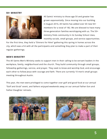 in August 2016, All Saints has added over 60 new 50+ members for a total of 182. We are blessed to have many three-generation families worshipping with us. The 50+ ministry finds community in its Sunday School class, monthly socials, small groups, and service opportunities.