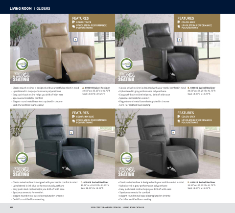 C. 609008 Swivel Recliner 30.50”w x 35.25”d x 41.75”h Seat 18.00”d x 19.25”h