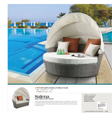 Modern classic styling paired with glamorous elements creates a unique addition to outdoor area in the Salena collection. Beige fabric features subtle texture with a gray wicker outer body cloth providing visual interest. It comes with accent pillows and canopy that further the transitional styling to complete the look.