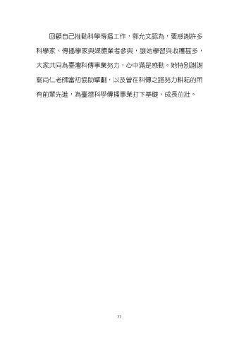 回顧自己推動科學傳播工作,郭允文認為,要感謝許多 科學家、傳播學家與媒體業者參與,讓她學習與收穫甚多, 大家共同為臺灣科傳事業努力,心中滿是感動。她特別謝謝 關尚仁老師當初協助擘劃,以及曾在科傳之路努力耕耘的所 有前輩先進,為臺灣科學傳播事業打下基礎、成長茁壯。 77