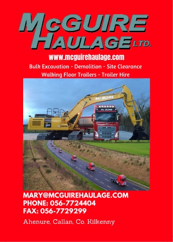 www.mcguirehaulage.com Bulk Excavation - Demolition - Site Clearance Walking Floor Trailers - Trailer Hire MARY@MCGUIREHAULAGE.COM PHONE: 056-7724404 FAX: 056-7729299 Ahenure, Callan, Co. Kilkenny