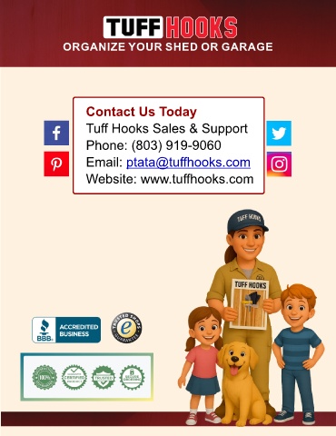 ORGANIZE YOUR SHED OR GARAGE Contact Us Today Tuff Hooks Sales & Support Phone: (803) 919-9060 Email: ptata@tuffhooks.com Website: www.tuffhooks.com