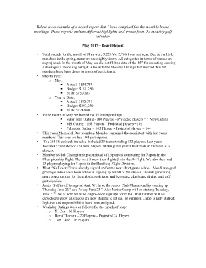 • Total rounds for the month of May were 3,226 Vs. 3,766 from last year. Due to multiple