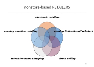 nonstore-based RETAILERS __________________________ electronic retailers vending machine retailing catalog & direct-mail retailers television home shopping direct selling 11