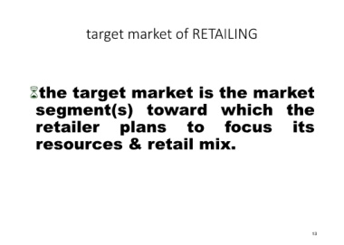 target market of RETAILING the target market is the market segment(s) toward which the retailer plans to focus its resources & retail mix. 13