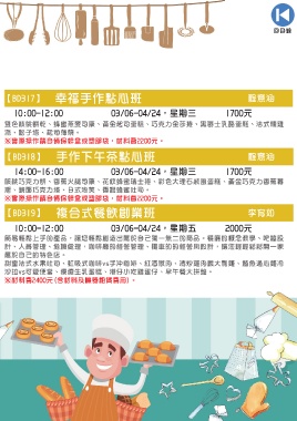 核桃巧克力餅、香蕉火腿司康、花紋蜂蜜瑞士捲、彩色大理石戚風蛋糕、黃金巧克力香蕉幕