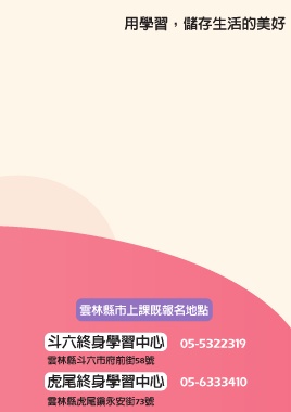 用學習,儲存生活的美好 雲林縣市上課既報名地點 斗六終身學習中心 05-5322319 雲林縣斗六市府前街58號 虎尾終身學習中心 05-6333410 雲林縣虎尾鎮永安街73號