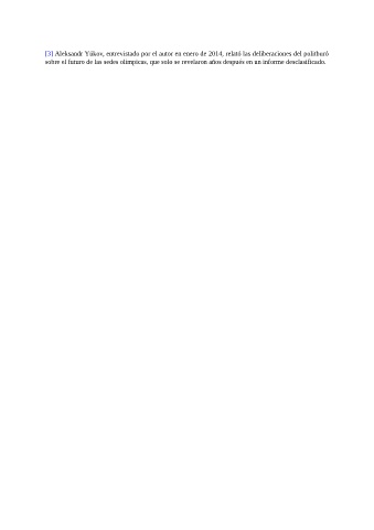 [3] Aleksandr Yúkov, entrevistado por el autor en enero de 2014, relató las deliberaciones del politburó sobre el futuro de las sedes olímpicas, que solo se revelaron años después en un informe desclasificado.