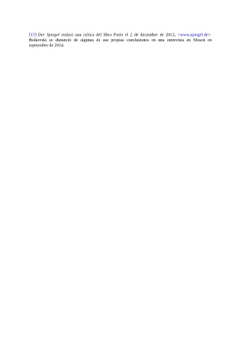 [15] Der Spiegel realizó una crítica del libro Putin el 2 de diciembre de 2013, <www.spiegel.de>. Belkovski se distanció de algunas de sus propias conclusiones en una entrevista en Moscú en septiembre de 2014.