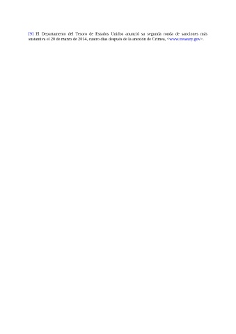[9] El Departamento del Tesoro de Estados Unidos anunció su segunda ronda de sanciones más sustantiva el 20 de marzo de 2014, cuatro días después de la anexión de Crimea, <www.treasury.gov>.