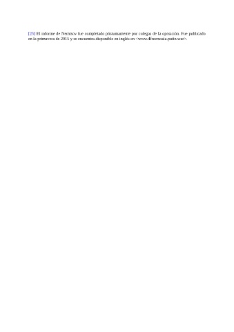 [25] El informe de Nemtsov fue completado póstumamente por colegas de la oposición. Fue publicado en la primavera de 2015 y se encuentra disponible en inglés en <www.4freerussia.putin.war>.