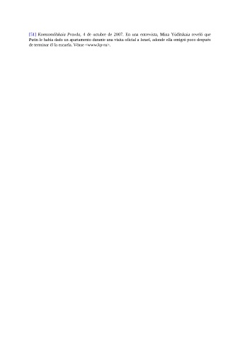 [51] Komsomólskaia Pravda, 4 de octubre de 2007. En una entrevista, Mina Yúditskaia reveló que Putin le había dado un apartamento durante una visita oficial a Israel, adonde ella emigró poco después de terminar él la escuela. Véase <www.kp-ru>.
