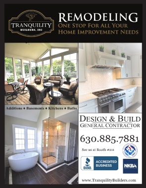 Additions ♦ Basements ♦ Kitchens ♦ Baths DESIGN & BUILD ______________ GENERAL CONTRACTOR ______________ _ 630.885.7881 See us at Booth #211 www.TranquilityBuilders.com