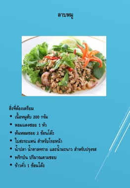 ลาบหมู สิ่งที่ต้องเตรียม • เนื้อหมูสับ 200 กรัม • หอมแดงซอย 1 หัว • ต้นหอมซอย 2 ช้อนโต๊ะ • ใบสะระแหน่ ส าหรับโรยหน้า • น ้าปลา น ้าตาลทราย และน ้ามะนาว ส าหรับปรุงรส • พริกป่น ปริมาณตามชอบ • ข้าวคั่ว 1 ช้อนโต๊ะ
