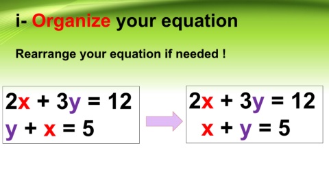 i- Organize your equation Rearrange your equation if needed ! 2x + 3y = 12 2x + 3y = 12 y + x = 5 x + y = 5