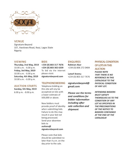 10.00 a.m. - 6.00 p.m. +234 (0) 803 302 6339 +234 (0) 806 272 0404 AUCTION