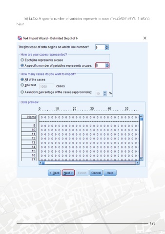 16) ในชอง A specififfifiic number of variables represents a case: กำหนดใหมีคา เทากับ 1 แลวกด Next 123