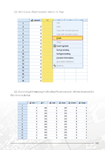 21) เลือก Column ที่ตองการวางแลว คลิกขวา กด Paste 22) เมื่อนำเขาขอมูลปจจัยและขอมูลการใชประโยชนที่ดินแยกรายประเภท เสร็จเรียบรอยแลวตอไปจะ เปนการหาความสัมพันธ 127