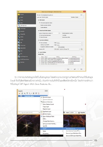 5) จากการนำเขาขอมูลจะไดเปนชั้นขอมูลจุด โดยแตละจุดจะปรากฏตามตำแหนงที่กำหนดไวในขอมูล Excel ซึ่งเปนไฟลที่แสดงชั่วคราวเทานั้น ตองทำการบันทึกใหเปนเชฟไฟลอีกครั้งหนึ่ง โดยทำการคลิกขวา ที่ชั้นขอมูล ไปที่ Export เลือก Save Features As… 135