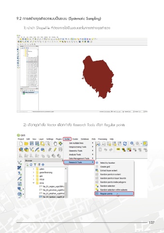 9.2 การสรางจุดสำรวจแบบเปนระบบ (Systematic Sampling) 1) นำเขา Shapefiffiile ที่ตองการใชเปนขอบเขตในการสรางจุดสำรวจ 2) เลือกชุดคำสั่ง Vector เลือกคำสั่ง Research Tools เลือก Regular points 137