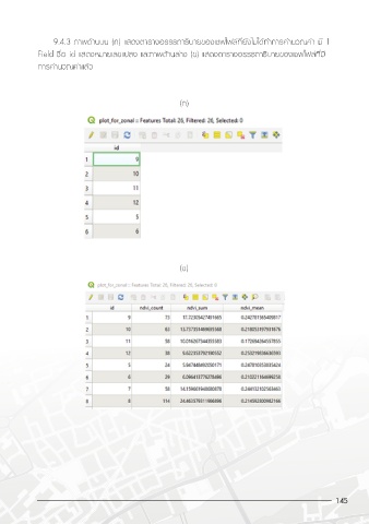 9.4.3 ภาพดานบน (ก) แสดงตารางอรรธถาธิบายของเชฟไฟลที่ยังไมไดทำการคำนวณคา มี 1 Field ชื่อ id แสดงหมายเลขแปลง และภาพดานลาง (ข) แสดงตารางอรรธถาธิบายของเชฟไฟลที่มี การคำนวณคาแลว (ก) (ข) 145