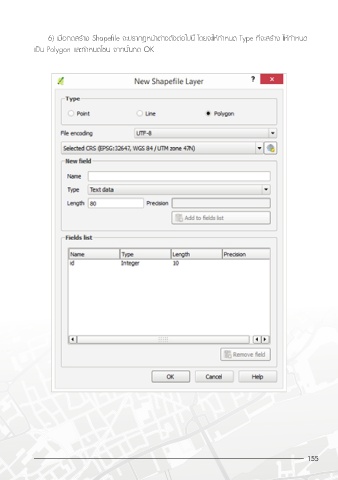 6) เมื่อกดสราง Shapeffiile จะปรากฏหนาตางดังตอไปนี้ โดยจะใหกำหนด Type ที่จะสราง ใหกำหนด เปน Polygon และกำหนดโซน จากนั้นกด OK 155