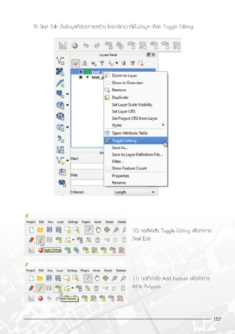 9) Start Edit ชั้นขอมูลที่ตองการสราง โดยคลิกขวาที่ชั้นขอมูล เลือก Toggle Editing 10) กดที่คำสั่ง Toggle Editing เพื่อทำการ Start Edit 11) กดที่คำสั่ง Add Feature เพื่อทำการ สราง Polygon 157