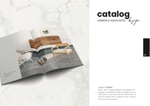 Designed a comprehensive binder and catalog system for Cabot Wrenn, Jessica Charles, Hancock & Moore and more high-end furniture makers. Designed concepts, executed, photo retouch and production.