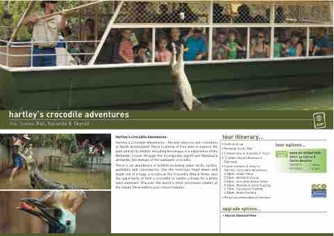 Hartley’s Crocodile Adventures - the best place to see crocodiles in North Queensland! There is plenty of free time to explore the park and all its wildlife including the the unique eco experience of the the Wetlands Cruise through the ecologically significant Melaleuca wetlands the the domain of the the saltwater crocodile There is an an abundance of wildlife including water birds turtles wallabies and and cassowaries See the notorious head shake and and death roll of a a a a a huge crocodile at at the Crocodile Attack Show also the opportunity to to hold a a a a a crocodile or or or cuddle a a a a a koala for a a a a a photo (own expense) Discover the world’s most venomous snakes at the Snake Show before your return transfer tour itinerary • Hotel pick-up