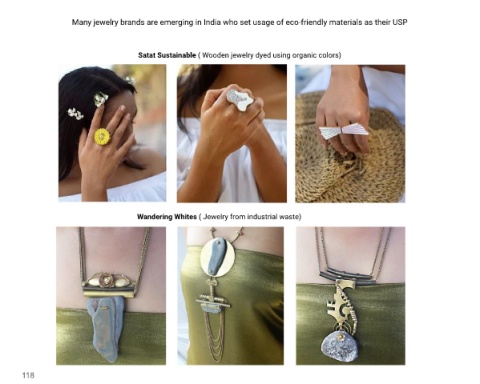 Many jewelry brands are emerging in India who set usage of eco-friendly materials as their USP Satat Sustainable ( Wooden jewelry dyed using organic colors) Wandering Whites ( Jewelry from industrial waste) 118
