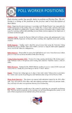 Each election worker has specific duties to perform on Election Day. The fol-