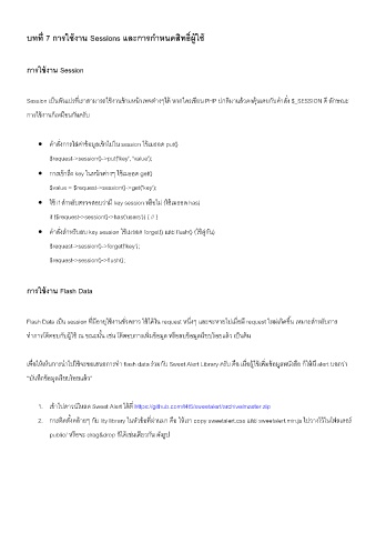 Flash Data เปน session ที มีอายุใชงานชั วคราว ใชไดใน request หนึ งๆ และจะหายไปเมื อมี request ใหม่เกิดขึ น เหมาะสําหรบการ