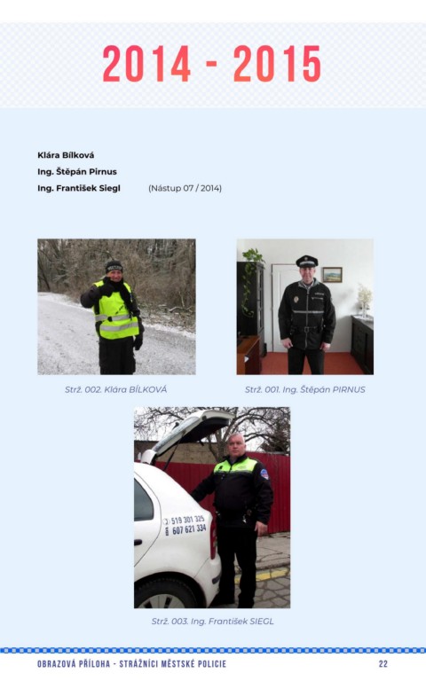 Klára Bílková Ing. Štěpán Pirnus Ing. František Siegl (Nástup 07 / 2014) Strž. 002. Klára BÍLKOVÁ Strž. 001. Ing. Štěpán PIRNUS Strž. 003. Ing. František SIEGL Obrazová příloha - Strážníci MĚSTSKÉ POLICIE 22