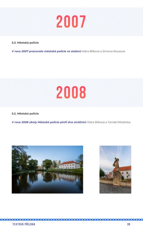 5.3. Městská policie V roce 2007 pracovala městská policie ve složení: Klára Bílková a Simona Rousová. 5.2. Městská policie V roce 2008 úkoly Městské policie plnili dva strážníci: Klára Bílková a Tomáš Mitošinka. Textová příloha 36