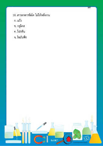 147 10. สารอาหารข้อใด ไม่ให้พลังงาน ก. แป้ง ข. กลูโคส ค. โปรตีน จ. ไขมันพืช