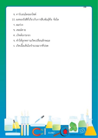 190 จ. คาร์บอนไดออกไซด์ 10. ผลของรังสีที่เกี่ยวกับการสืบพันธุ์คือ ข้อใด ก. ผมร่วง ข. เซลล์ตาย ค. เกิดต้อกระจก จ. ทําให้ลูกหลานเกิดเปลี่ยนลักษณะ ง. เกิดเนื้อเส้นใยจํานวนมากที่ปอด