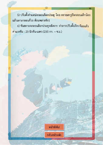 31 5) ปรับตั้งตําแหน่งกลอนล็อกประตู โดย คลายสกรูยึดกลอนเล็กน้อย แล้วเดาะกลอนด้วย ต้อนพลาสติก) 6) ขันสกายดกลอนล็อกประตูหลังจาก ท่าการปรับตั้งเรียบร้อยแล้ว ค่าแรงขัน : 23 นิวตัน-เมตร (235 กก. – ช.ม.)