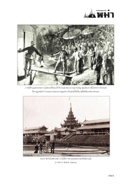 ประวัติศาสตร์จานเดียว ภาพเขียนแสดงเหตุการณ์ตอนที่พระเจ้าธีบอและพระนางศุภยลัตถูกคุมพระองค์โดยทหารอังกฤษ มีราษฎรพม่าจำานวนมากออกมารอดูเพราะไม่เคยให้เห็นกษัตริย์ของพวกเขาเอง พระราชวังมัณฑะเลย์ ภายใต้การควบคุมของกองทัพอังกฤษ (ภาพจาก British Library) ๑๒๑